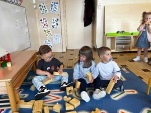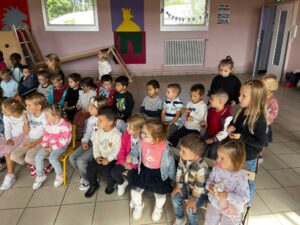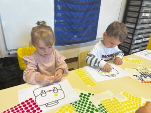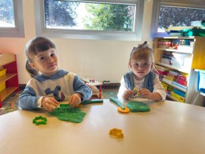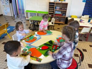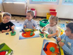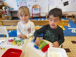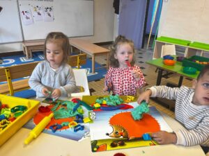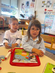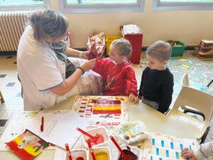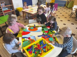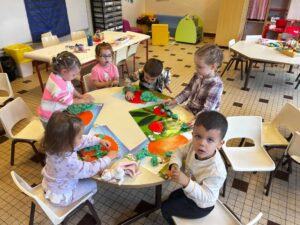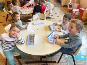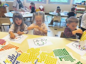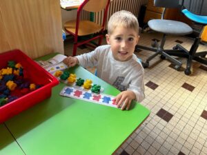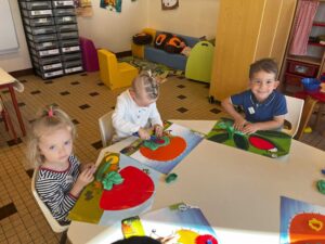 Les premiers pleurs passés, nous avons chanté et réalisé de nombreuses activités: peinture, pâte à modeler, collage de gommettes, puzzles, constructions…